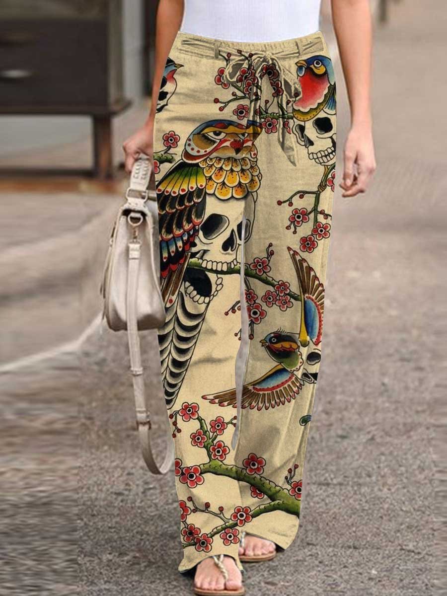 Vintage Skull Printed Lace-Up Loose Pants